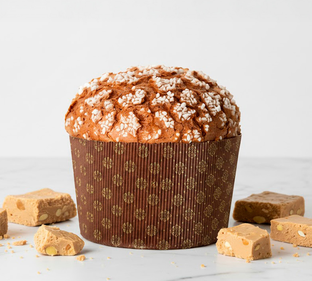 Ingredientes: harina de trigo(GLUTEN), mantequilla (LECHE), turrón de Jijona, turrón Alicante, yema de HUEVO, miel, azúcar, levadura fresca y aroma panettone. Glaseado: clara de huevo, chocolate en polvo, avellana (FRUTOS DE CÁSCARA), almendra (FRUTOS DE CÁSCARA), azúcar perlado, almidón de maíz.